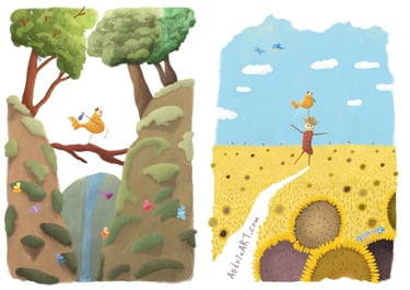 Welcome to my gallery! I create colorful, cheerful, and cheeky illustrations for children's stories — pictures that spark imagination, bring characters to life, and make readers' eyes light up. Every illustration is a tiny world waiting to be explored, full of warmth, humor, and a pinch of magic.